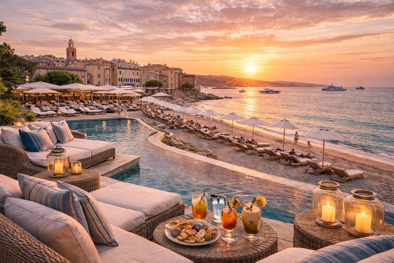 Cócteles al atardecer, vistas al puerto y ambiente chic definen la experiencia sunset en Saint-Tropez.